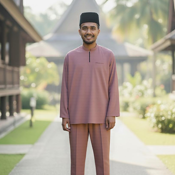 TELUK BELANG Malásia SIPO Colarinho tradicional mandarim rosa-rosa Baju Melayu com Songkok preto, caminho pavimentado